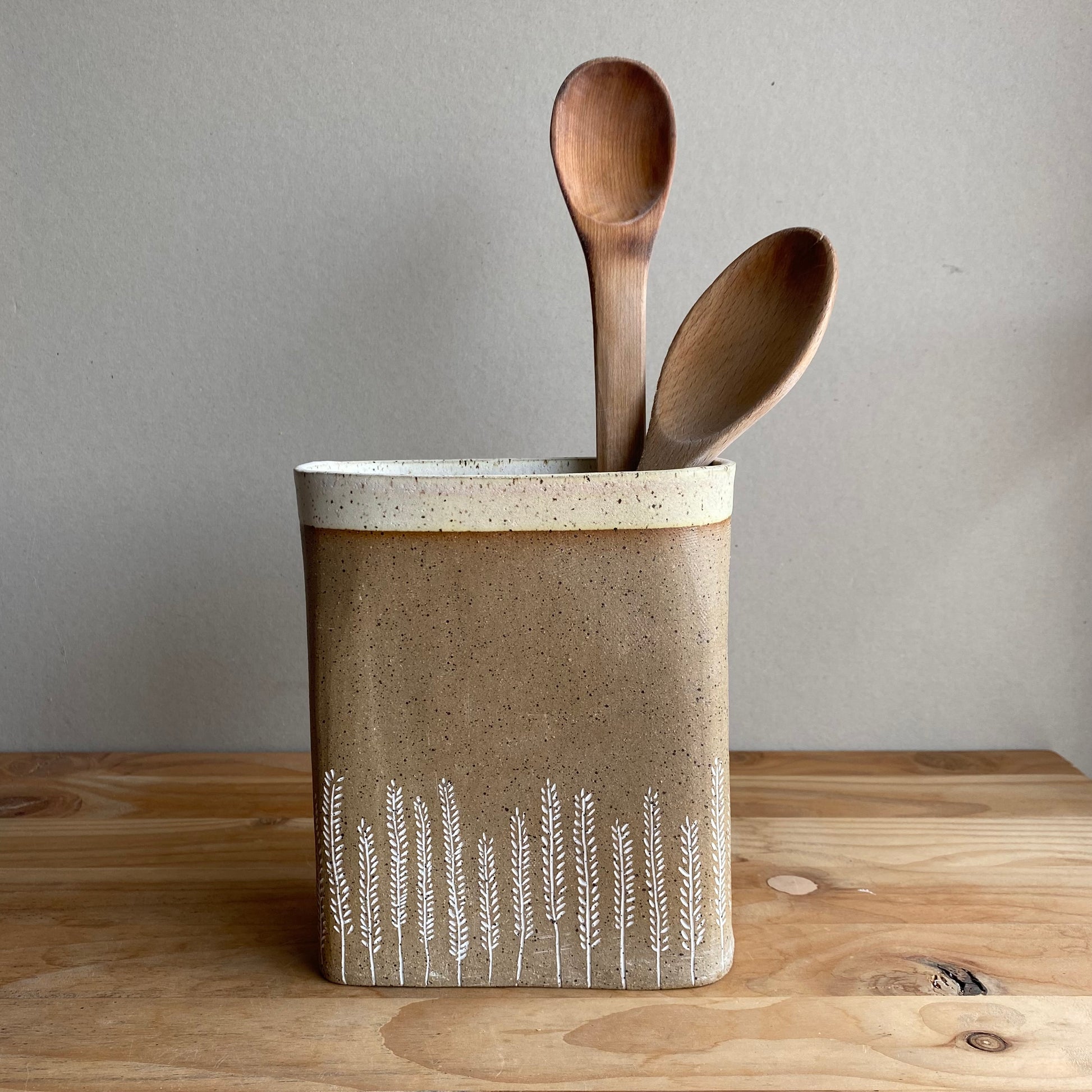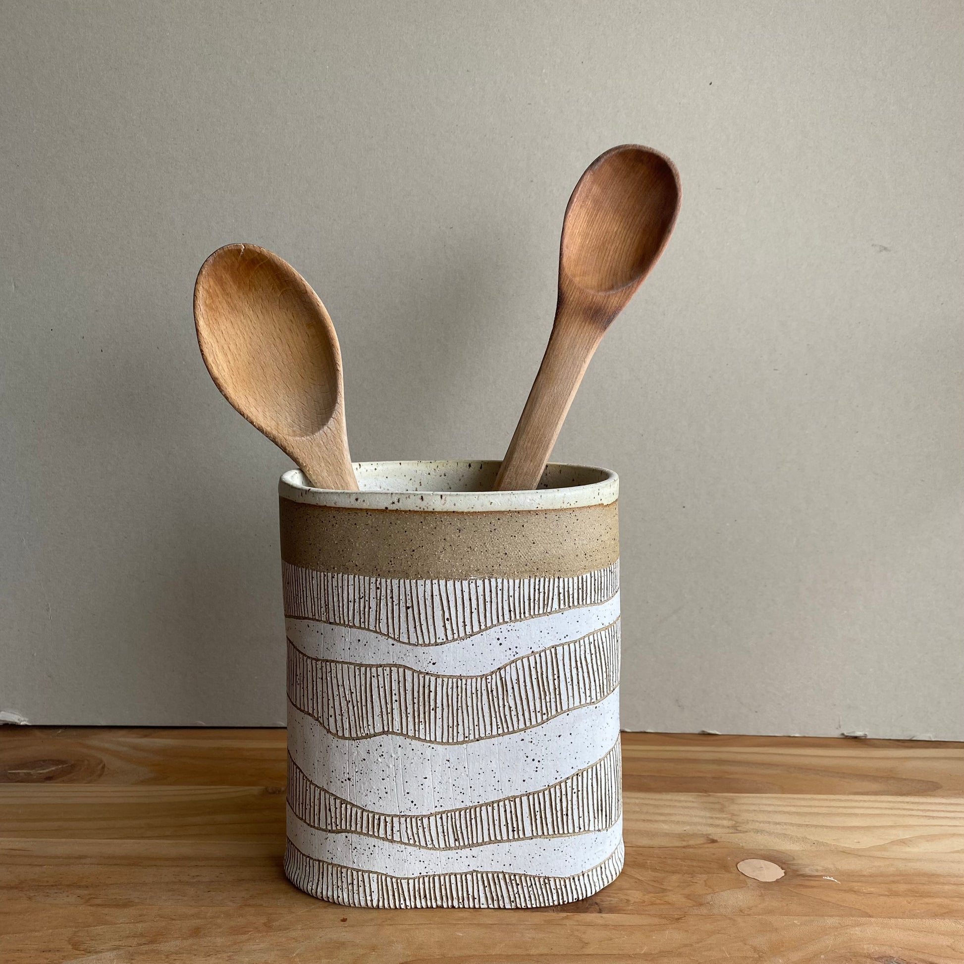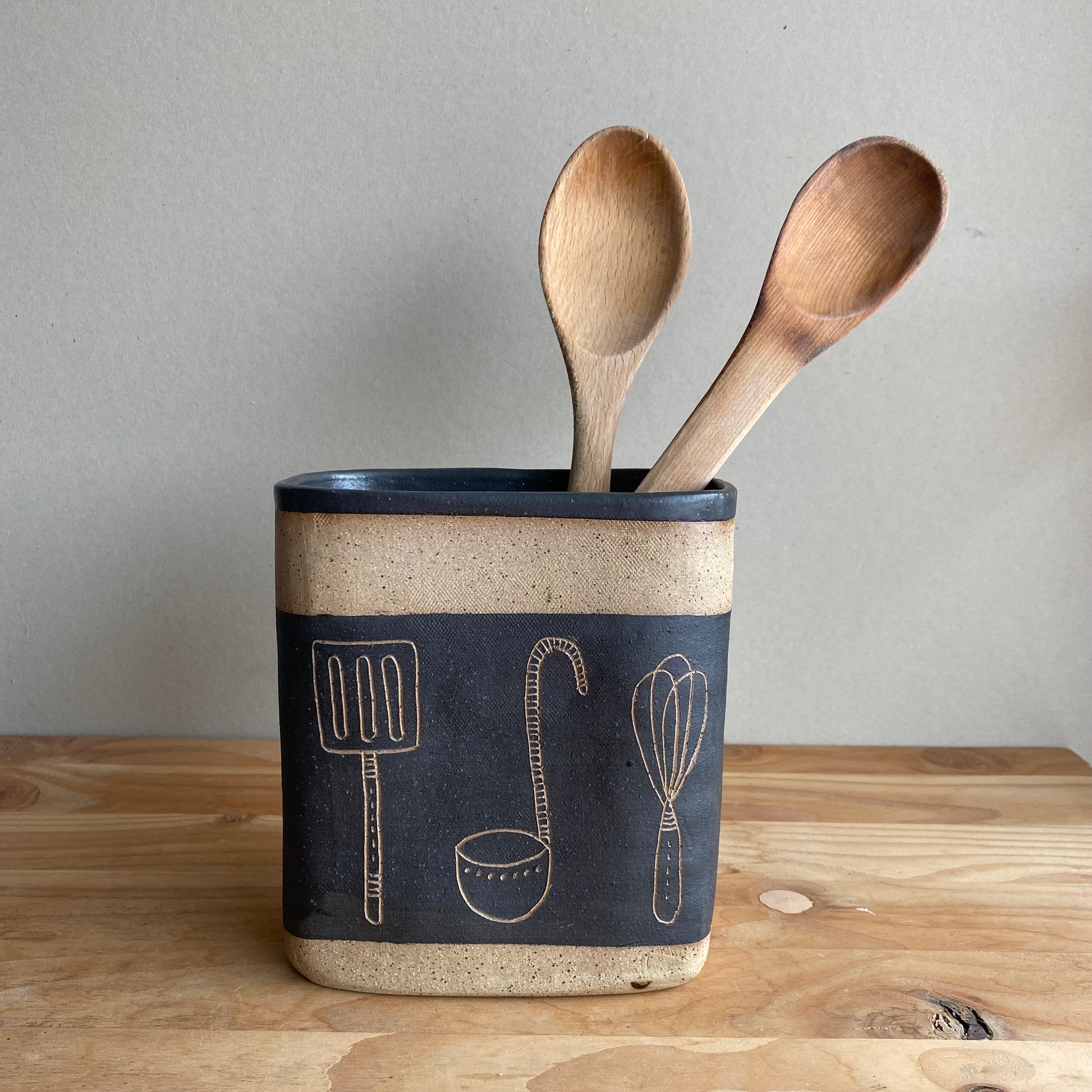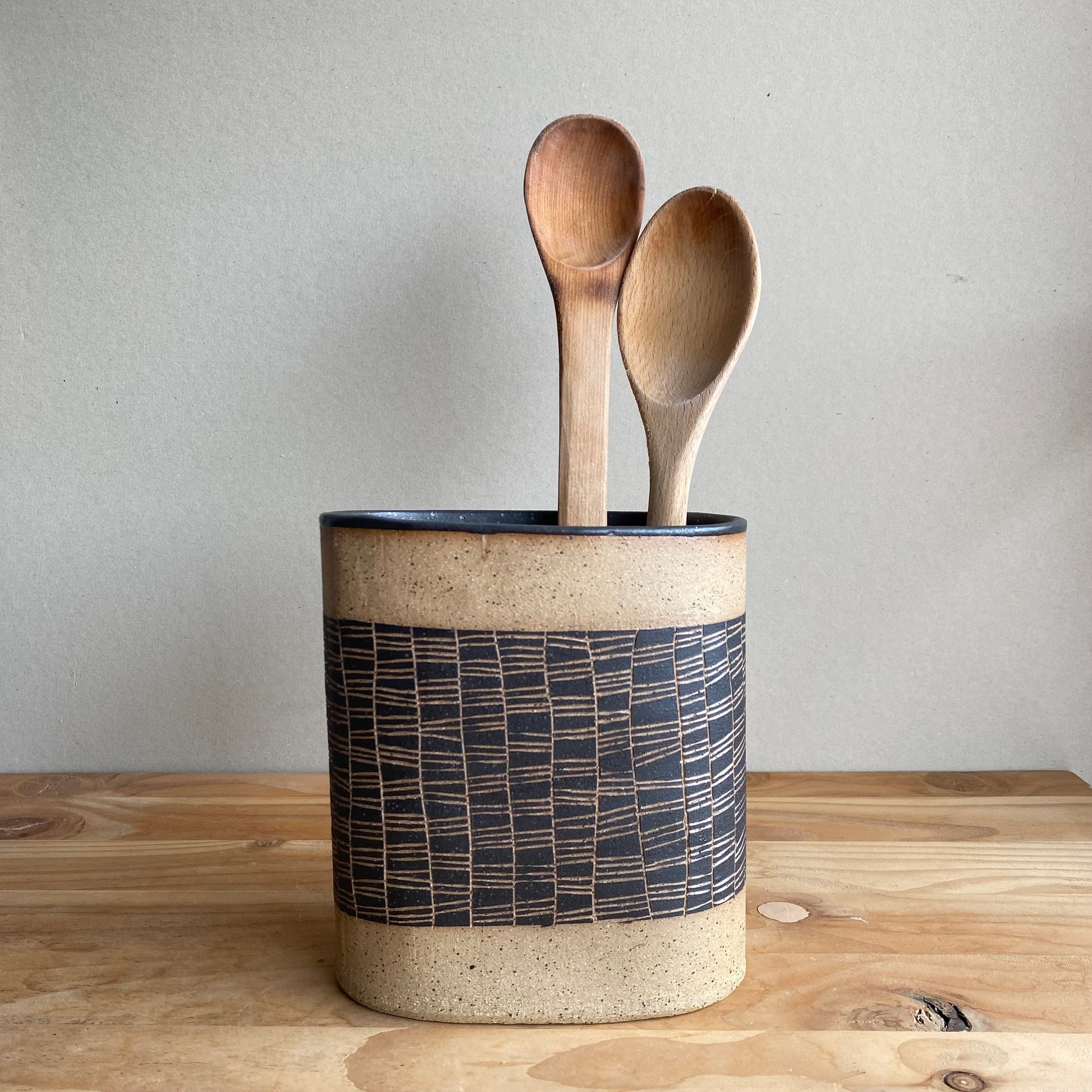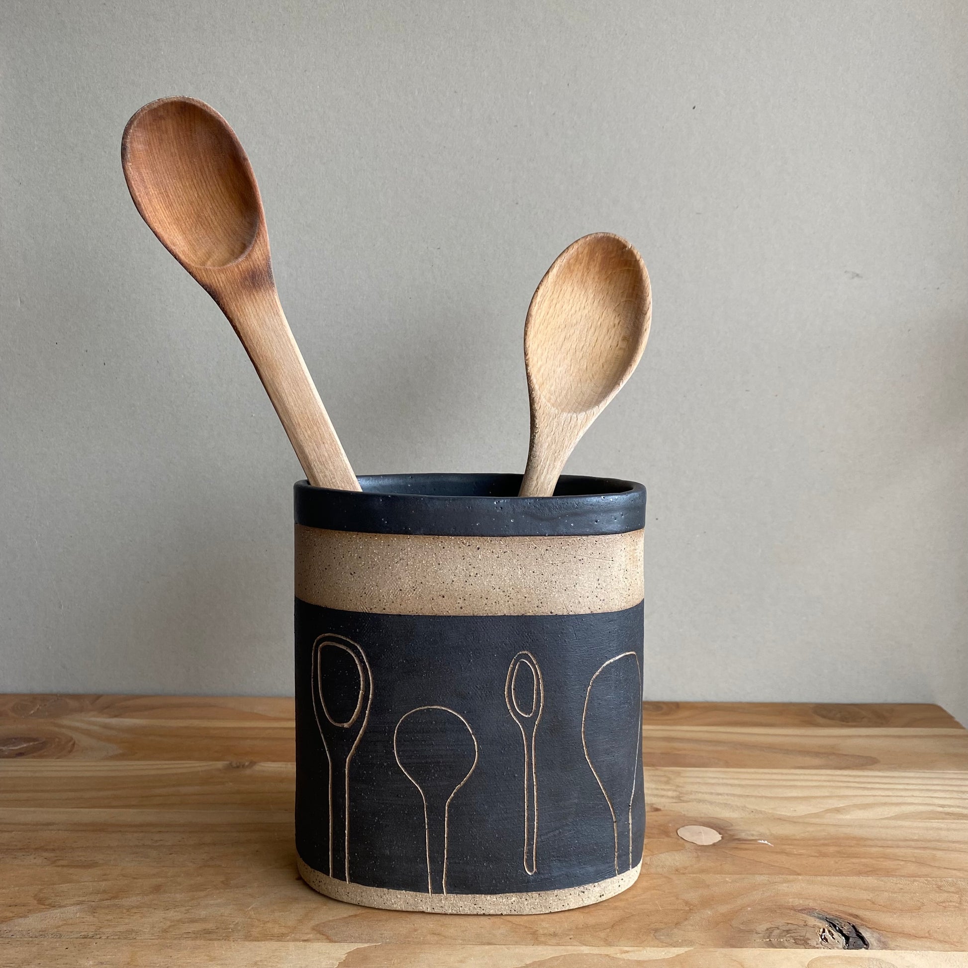 Nuestros porta utensilios están hechos a mano en cerámica gres y cada uno tiene un tallado diferente que lo hace único.