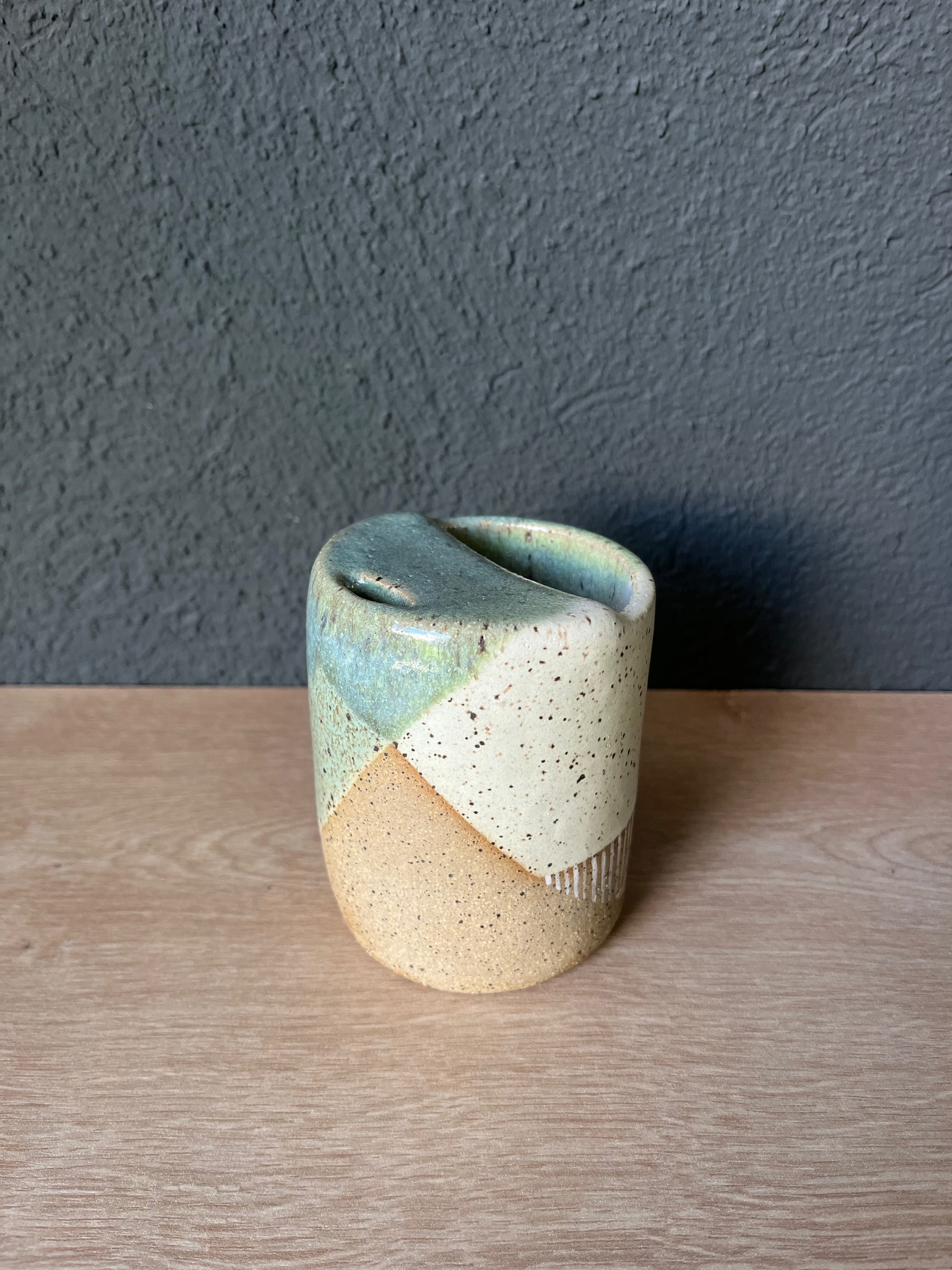 Cada pieza es hecha a mano en cerámica gres, por lo que no hay dos iguales. El tamaño está pensado para que quepa cómodamente en el portavasos del auto y su diseño con tapa integrada ayuda a evitar derrames.