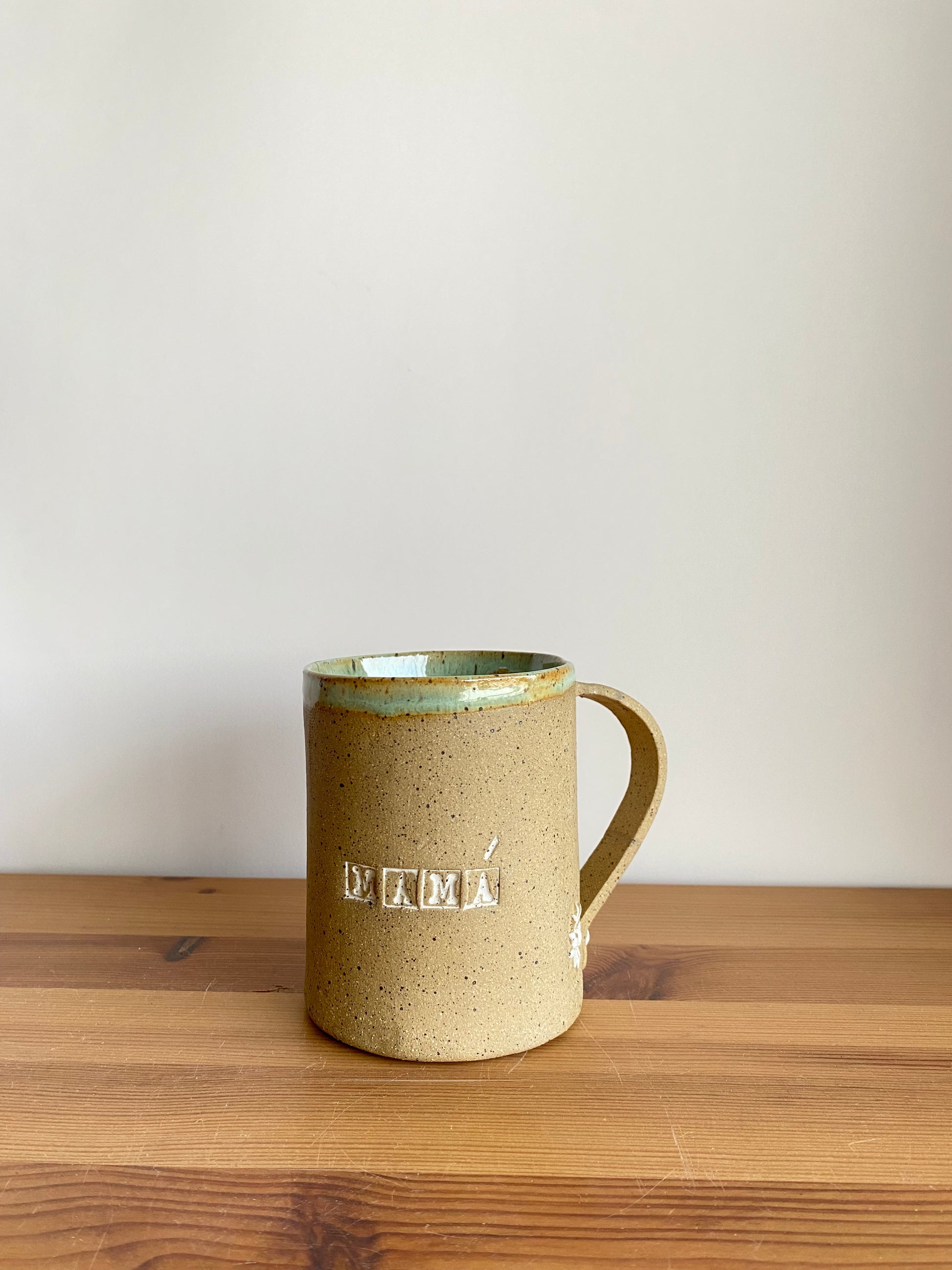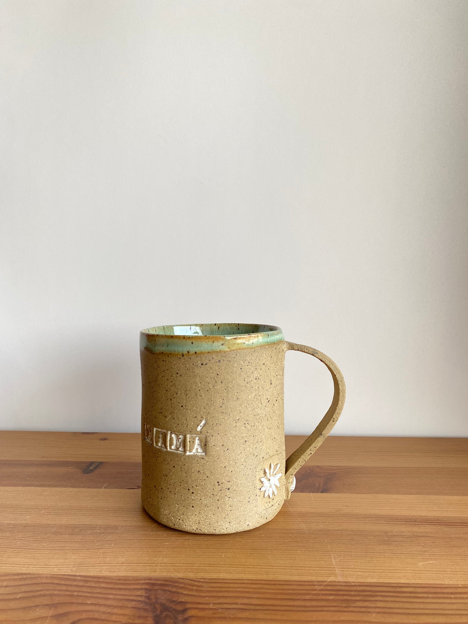 Tazón de cerámica gres. Cada pieza es única (sólo uno de cada diseño), modelada y pintada a mano. Esmalte verde por dentro y borde letras "Mamá" en blanco.
