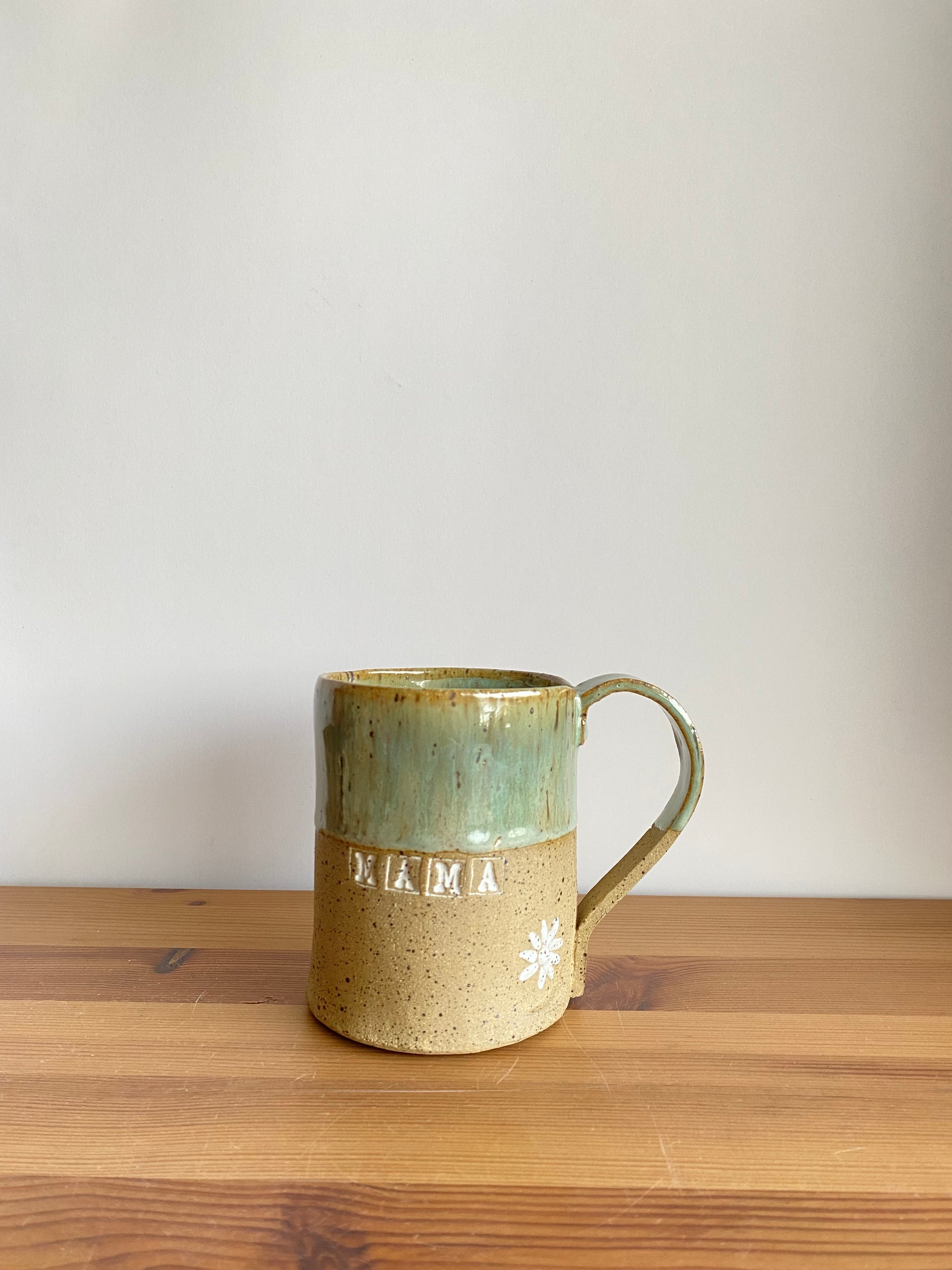 Tazón de cerámica gres. Cada pieza es única (sólo uno de cada diseño), modelada y pintada a mano. Esmalte verde y letras blancas "Mamá".